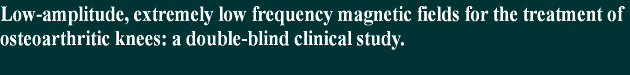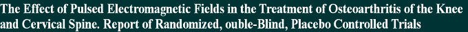 OBJECTIVE. We conducted a randomized, double blind clinical trial to determine the effectiveness of pulsed electromagnetic fields (PEMF) in the treatment of osteoarthritis (OA) of the knee and cervical spine. METHODS. A controlled trial of 18 half-hour active or placebo treatments was conducted in 86 patients with OA of the knee and 81 patients with OA of the cervical spine, in which pain was evaluated using a 10 cm visual analog scale, activities of daily living using a series of questions (answered by the patient as never, sometimes, most of the time, or always), pain on passive motion (recorded as none, slight, moderate, or severe), and joint tenderness (recorded using a modified Ritchie scale). Global evaluations of improvement were made by the patient and examining physician. Evaluations were made at baseline, midway, end of treatment, and one month after completion of treatment. RESULTS. Matched pair t tests showed extremely significant changes from baseline for the treated patients in both knee and cervical spine studies at the end of treatment and the one month follow-up observations, whereas the changes in the placebo patients showed lesser degrees of significance at the end of treatment, and had lost significance for most variables at the one month follow-up. Means of the treated group of patients with OA of the knee showed greater improvement from baseline values than the placebo group by the end of treatment and at the one month follow-up observation. Using the 2-tailed t test, at the end of treatment the differences in the means of the 2 groups reached statistical significance for pain, pain on motion, and both the patient overall assessment and the physician global assessment. The means of the treated patients with OA of the cervical spine showed greater improvement from baseline than the placebo group for most variables at the end of treatment and one month follow-up observations; these differences reached statistical significance at one or more observation points for pain, pain on motion, and tenderness. CONCLUSION. PEMF has therapeutic benefit in painful OA of the knee or cervical spine.
